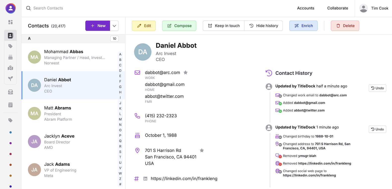 Multi-account, multi-platform bidirectional sync. Edit your contacts from anywhere, TitleDock will merge and sync your changes to every endpoint.